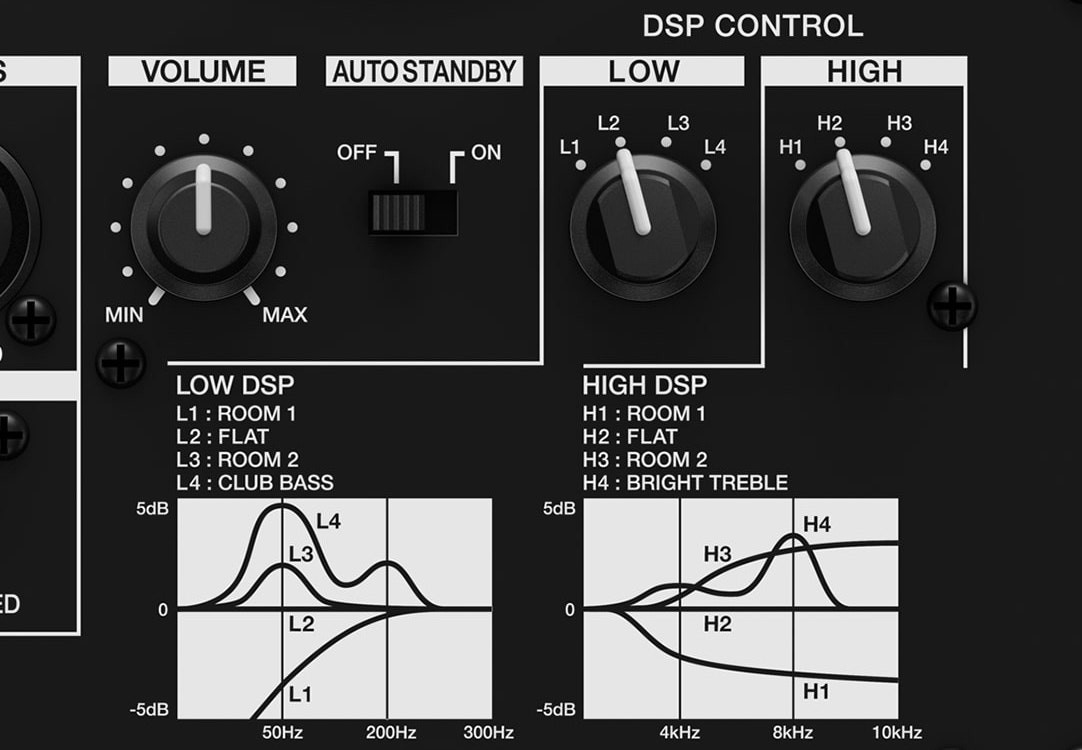 Встроенные DSP позволяют подстраивать звучание под конкретное помещение с 4 настройками низких частот и 4 настройками высоких частот, что дает в общей сложности 16 вариантов эквализации. Таким образом для студийной работы можно выбрать более ровные параметры АЧХ, а для диджеинга приподнять НЧ и ВЧ.