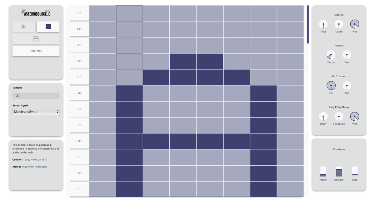 Для начала в Asteroidblock.io предлагается выбрать одно из небесных тел. Данные о близости астероида к Земле синтезатор получает в реальном времени через API от NASA, которые влияют на базовые параметры звучания. Далее всё привычно: пиано-ролл, эффекты, разные синтезаторы (их пять), огибающие, регулировка темпа, возможность импорта в файлы WAV и так далее.