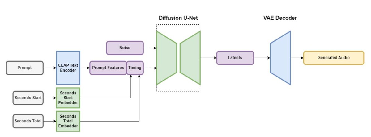 Stable Audio работает с необработанными семплами, чтобы генерировать аудио высокого качества. Модель обучалась на более чем 800 000 фрагментах лицензионной музыки аудиотеки AudioSparks. Создатели заявляют, что в отличие от Stable Diffusion, где наиболее популярной задачей является стилизация под какого-либо художника, Stable Audio не получится использовать похожим образом. По мнению компании, главной целью пользователей всё же будет являться творчество — создание эффектов, партий или целых треков. Кроме того, потенциальное применение видится в генерации фоновой музыки (например, для видео, рекламы или подкастов)