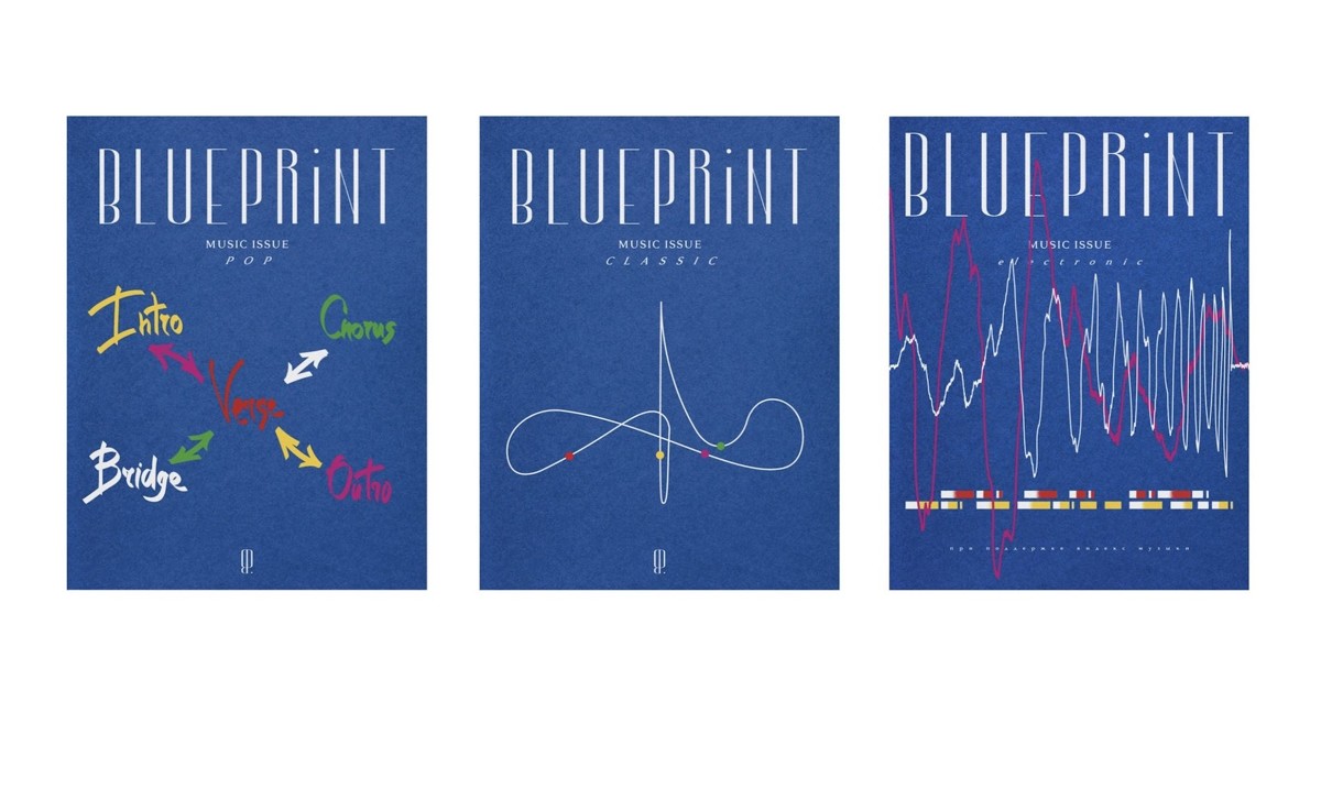 «На обложке номера про классическую музыку я изобразил движение дирижерской палочки. Этот прием я подсмотрел в книгах про дирижерское искусство. В обложке Pop зашифрован ребус. Это базовая структура поп-песни, которая строится из интро, куплета, припева, бриджа и финала. Ломаные линии на обложке номера про электронную музыку — это отсылка к интерфейсу DAW, программы, которой пользуются все электронщики. Ну а абстрактные геометрические формы на блокноте — это оммаж старым джазовым афишам, которые я накопал в интернете, когда делал ресерч», — рассказал Иван Шпак