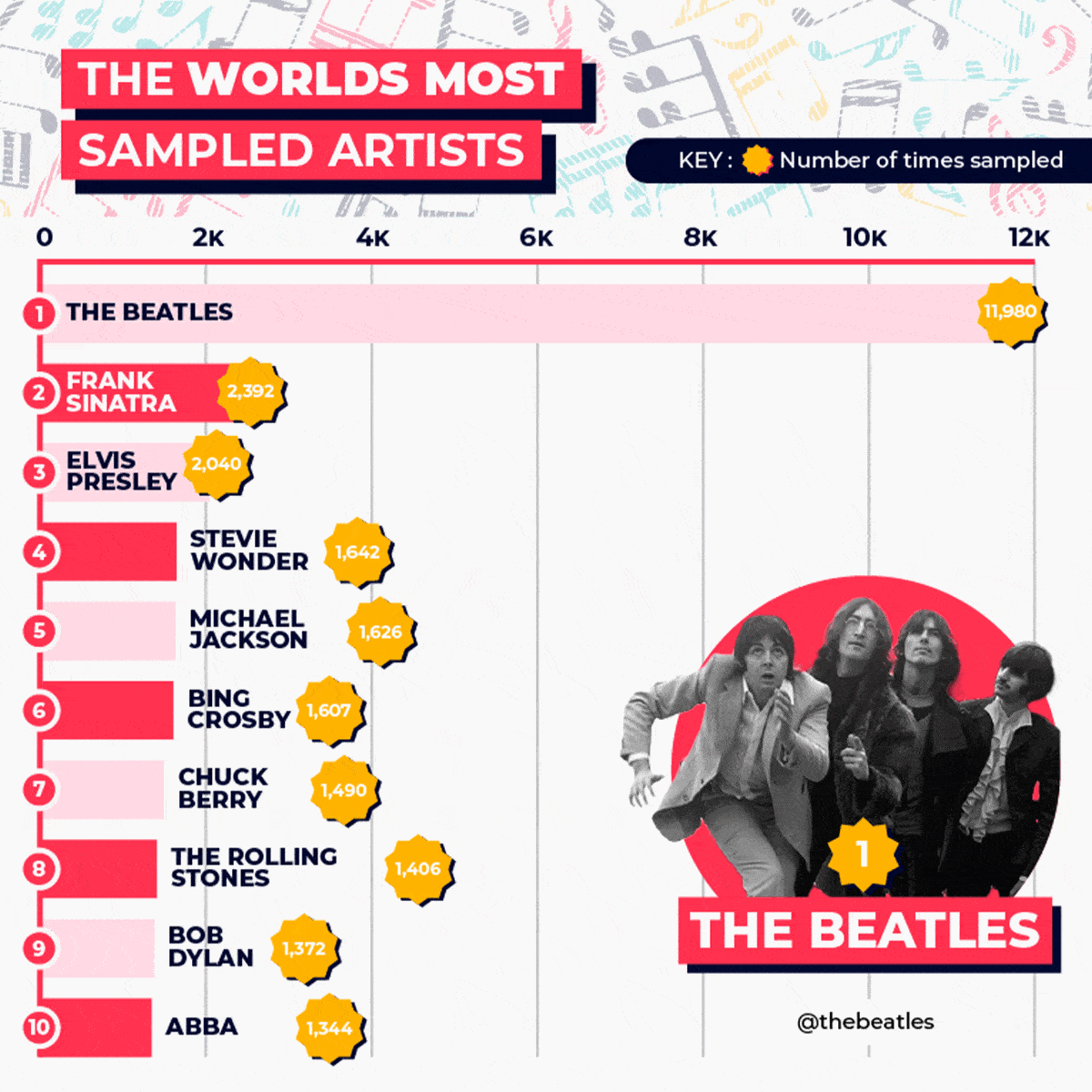 Исследователи из компании Slingo проанализировали базу данных платформы Who Sampled и выявили, что наиболее семплируемой группой в истории являются The Beatles. Cемплы из их песен фигурируют в 11 980 композиций. Если бы все из них были официально лицензированы, дополнительный доход The Beatles составил бы миллионы долларов ежегодно.