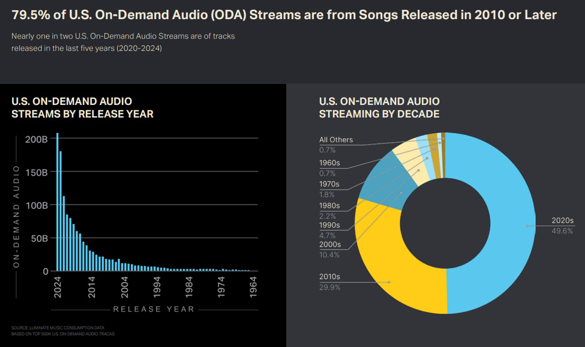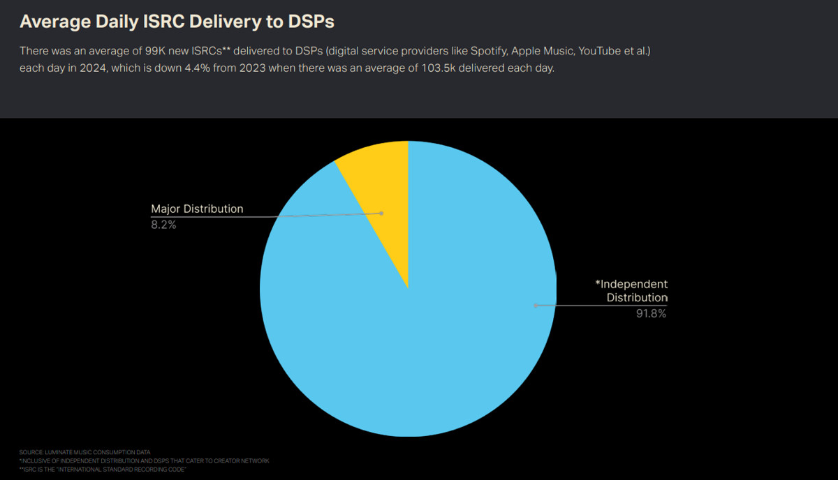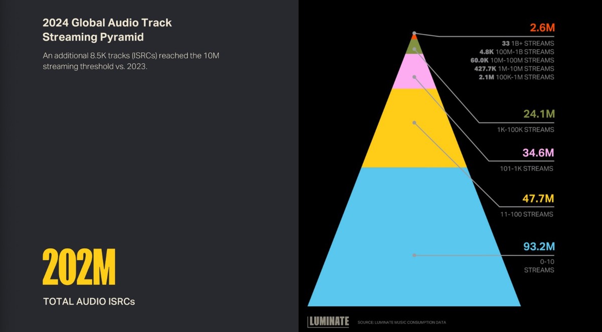 • Всего отслеживанию подверглось 202 млн треков. 93,2 млн из них были прослушаны за год 10 или меньше раз, а 47,7 млн — лишь от 11 до 100 раз. 87% всей музыки набрало в 2024 году меньше 1 000 прослушиваний. Некоторые стриминги объявили своеобразную войну композициям, у которых менее 1 000 прослушиваний: за такие Spotify больше не выплачивает роялти, а Deezer пессимизирует их в выдаче.